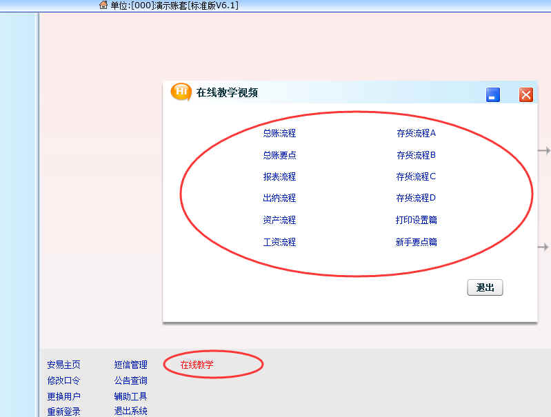 登錄賬套后,在主界面的下方,有一個在線教學的鏈接,可以在線看各模塊操作錄像,具體如下圖。